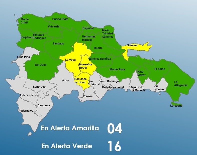 Las provincias en alerta amarilla son La Vega, Monseñor Nouel, Samaná y San José de Ocoa, por posibles